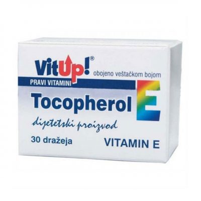30 Dražeja. VitUp Pravi vitamini – TOCOPHEROL E je dijetski proizvod kojim se podmiruju dnevne potrebe organizma za vitaminom E. Predstavljaju neophodan dodatak ishrani.